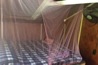 A twin bed fits snugly, next and perpendicular to the aparador. Like domino pieces, I comment to myself playfully. The bed's cross arms are made of tightly-woven cane on top of which I've set a colorful mat. Removable corner rods hold up at nighttime the mosquito net. The latter is otherwise folded and tucked under a bumpy, kapok cotton-filled pillow and a rumpled blanket on the head of the bed.